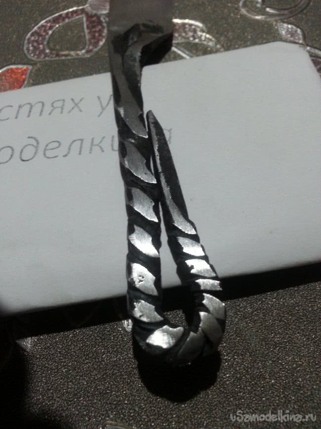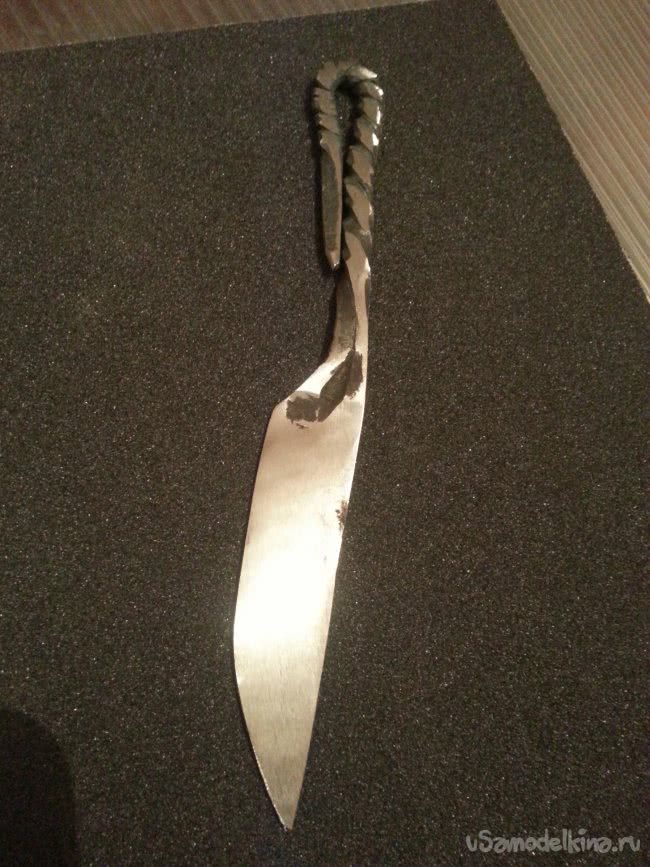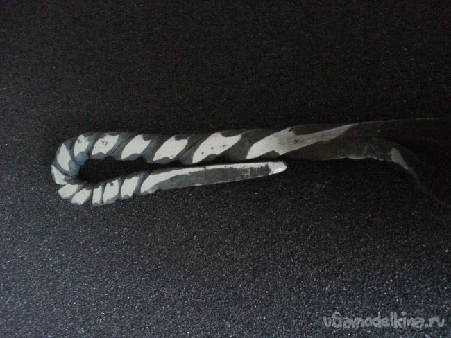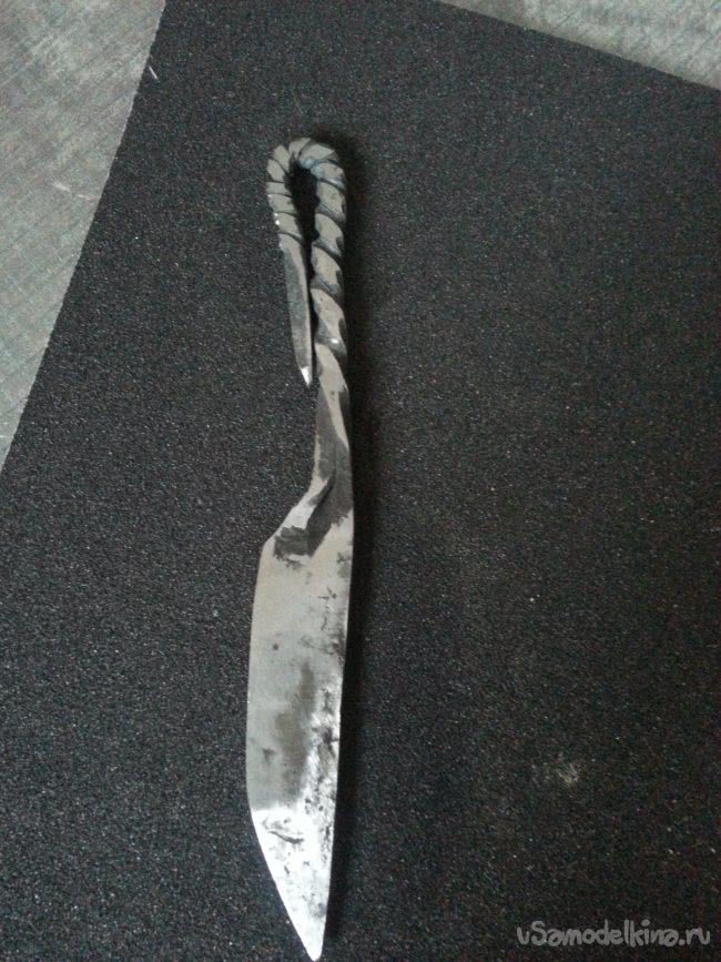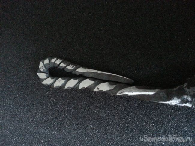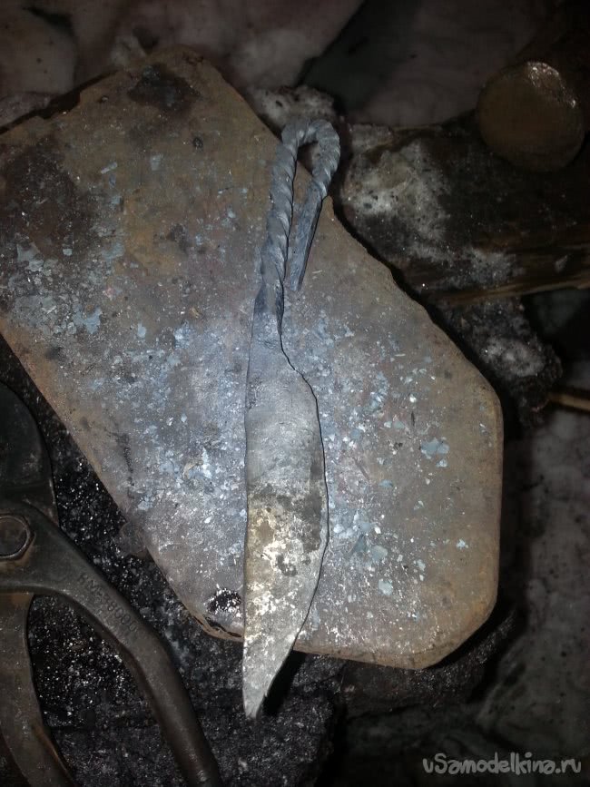 После ковки лезвия приступаю к формировке хвостовика, ручку ножа я решил сделать декоративную кованую ручку. Нагреваю и начинаю ковать хвостовик формой квадрата. После 3 или 4‐х нагревов вытягиваю хвостовик до нужной длины. Нагреваю еще раз, далее зажимаю в тисках, и держав за хвостовик, начинаю закручивать и за два раза закручиваю, как нужно мне. Нагреваю, а затем загибаю ручку под удобный хват, вот и все с ковкой.