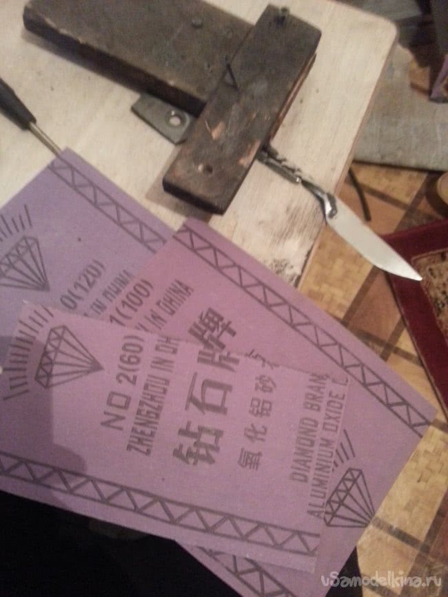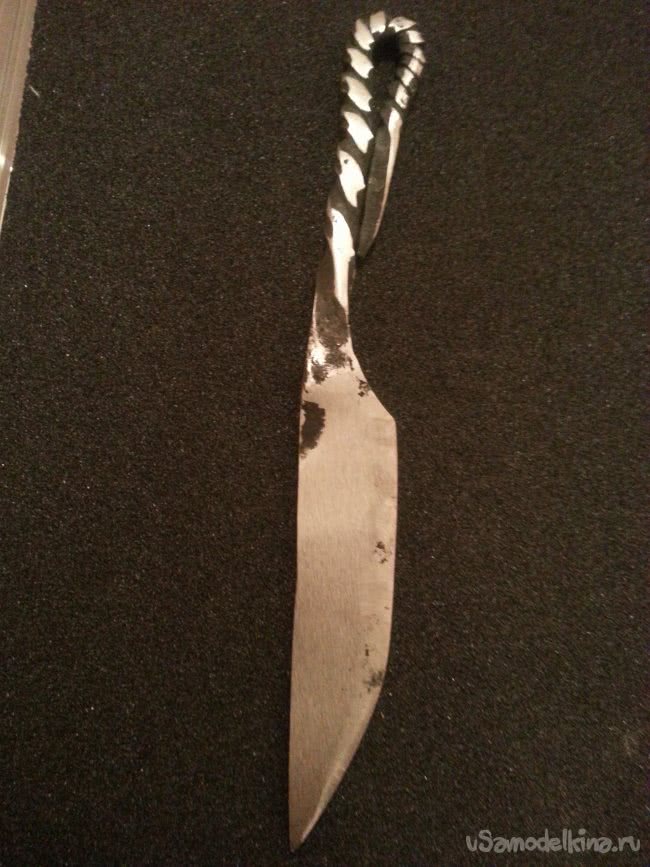 Ручку решил оставить как есть, чтобы видно было ковку. На Гриндере, на 120 бумаге, шлифую ручку до малозаметных рисок. Далее на станке формирую форму клинка по шаблону. Металл берется тяжело, но спасает что клинок нужно просто отшлифовать, ведь я сразу отковал нужную толщину. Спустя пол часа я наконец-то закончил шлифовать на станке. Зажимаю нож струбциной и шлифую вручную. К сожалению у меня нет мелкой бумаги, осталось только 60, 100 и 120, а еще 400ка так, что до блеска пока не получится отшлифовать. А травить в кислоте не охота. Вот и все нож готов.