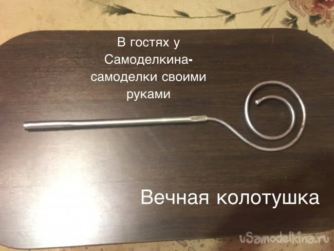 Среди металлома нашлась тонкая трубка из нержавейющей стали с наружным диаметром 10 мм. Из этой трубки была согнута спираль Архимеда, малый диаметр которой примерно 90 мм, большой - 170 мм, а шаг между витками 25 мм. Конец большого витка спирали плавно на расстоянии 70 мм от ближнего торца трубки сгибаем в плоскости этой спирали на прямой угол и выпрямляем этот конец трубки. Раньше гардины окон в нашем доме были из трубки нержавейющей стали с наружным диаметром 18 мм. Из-за этой трубки для рукоятки будущей колотушки отрезали ножовкой по металлу отрезок длиной 400 мм и острые кромки на обеих торцах округлили плоским напильником. Внутрь отрезка трубки вставили прямой конец спирали Архимеда. В зазор между внутренней стенкой отрезка трубки и с наружной стенкой прямого конца спирали по окружности установили стержни двенадцати гвоздей диаметром 3 мм. Тринадцатый гвоздь забили между двумя соседними гвоздями молотком и ножовкой по металлу отрезали головки этих гвоздей. Чтобы прямой конец спирали не поворачивался внутри рукоятки (отрезка трубки), зубилой вмяли стенку отрезка трубки вдоль и напротив стержней гвоздей. Выполнять это продольное углубление необходимо за несколько приемов, постоянно наблюдая за глубиной, чтобы насквозь не отрезать стенку отрезка трубы. После проверки неподвижности соединения рукоятки со спиралью Архимеда, пространство между стержнями гвоздей и стенками трубок заполнили эпоксидным клеем и оставили колотушку на сутки при положительной температуре окружающей среды для высыхания клея. Такой колотушкой пользуемся более пяти лет. Зимой и летом она висит во дворе на сухой ветке яблони. До использования данной колотушки пользовались покупными пластмассовыми, которые ломались каждый год.