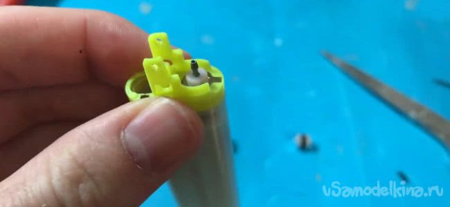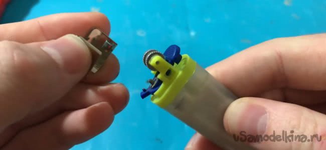 Теперь необходимо подготовить зажигалку. По дефолту она выпускает очень мало газа, за счёт чего и получается классический огонёк, но объём выходящего газа можно категорически увеличить, тем самым увеличив размер пламени. Для этого, просто разбираем верхнюю часть зажигалки, чтобы остался один вентиль, который и сдерживает весь газ под давлением внутри. Этот вентиль нужно немного открутить, так, чтобы он поднялся, примерно как на фото ниже. Но газ не должен при этом выходить сам.