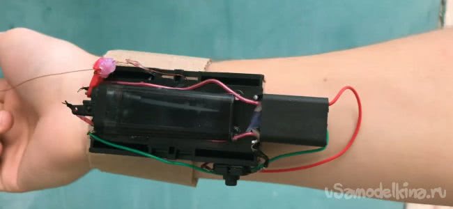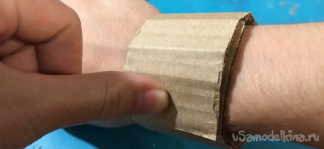 С помощью канцелярского ножа проделываю надрезы на картоне, для лучшей пластичности, после чего, делаю пару меток под свою руку и делаю магнитное крепление из двух неодимовых магнитов. Затем, приклеиваю всю конструкцию на данное крепление. В общем делаем всё так, как показано на фото: