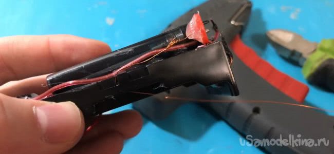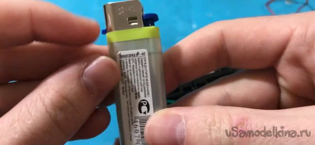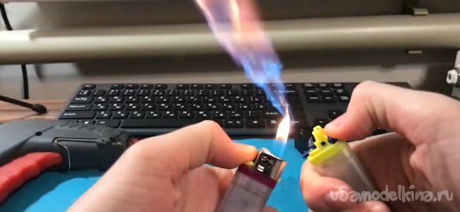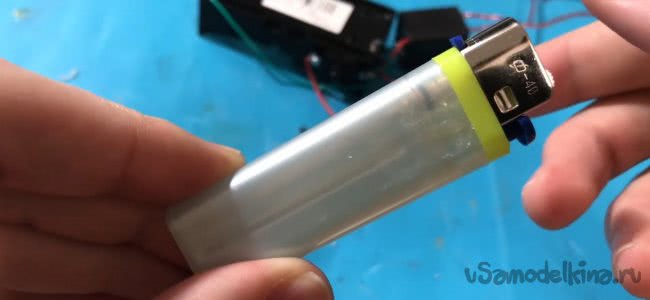 Следующим шагом, устанавливаем зажигалку на холдер, точнее, на его нижнюю часть. Я просто приклеил, но желательно, сделать какой-нибудь крепёжный элемент, который будет позволять менять использованную зажигалку на новую, подготовленную. (не обращайте внимания, что цвет зажигалки поменялся, просто, оказалось, что серая зажигалка имела газ под более низким давлением и он выходил не так красочно, как из моей старой чёрной зажигалки). После чего, на заднюю часть приклеиваем и высоковольтный модуль. Ну, а затем, размещаем провода перед зажигалкой так, чтобы газ проходил ровно через высоковольтную дугу и поджигался. Фиксируем эти провода, но желательно, не термоклеем, а то поплавиться, в идеале нужно примотать всё это дело другой проволокой и укрепить железом. Ну и располагаем оставшиеся провода питания вдоль корпуса. В общем, делаем всё так, как показано на фото: