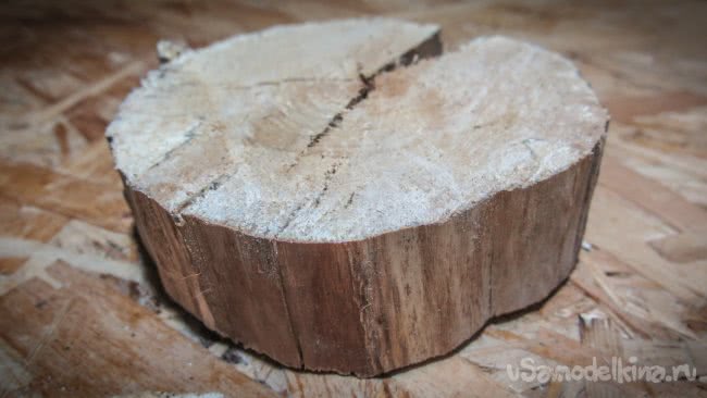 Для самого светильника взят спил полена из осины. У вас это может быть другой материал. Обычной ручной пилой отпиливаем кругляш нужной ширины.