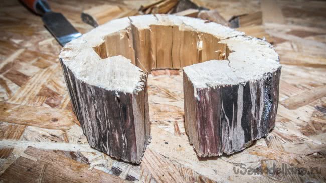 Далее стамеской выбираем внутреннюю часть. Тут уже фантазию включаем на полную – от вида и расположения выборки будет зависеть вид самого светильника.