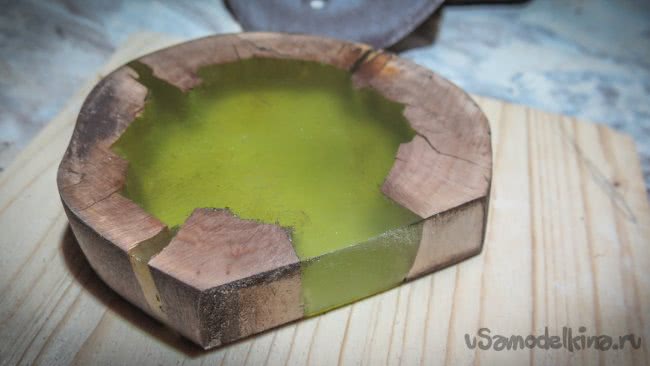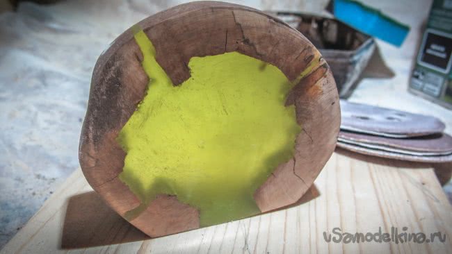 Дальше на древесину можно нанести слой масла. У меня в наличии был тёмный венге. Втираем в дерево обычной губкой для получения нужного оттенка, а со смолы излишки снимаем. Пока дерево впитывает масло можно заняться основанием.