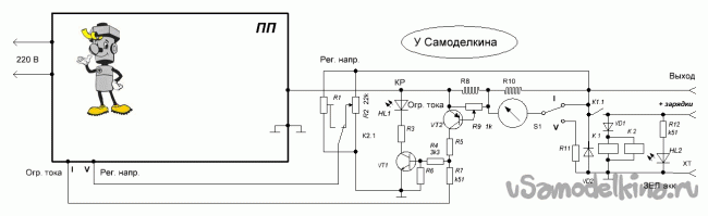 На схеме не указана кнопка, включенная через резистор пару десятков Ом между гнездами «Выход» и «+ зарядки», установленная на задней стенке и используемая для принудительного включения режима ЗУ без АКБ.