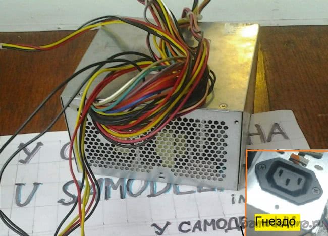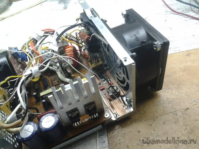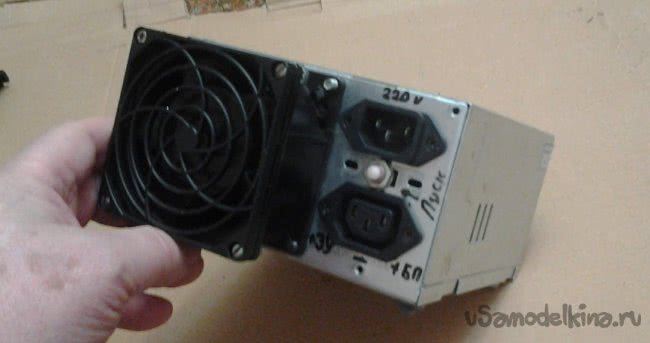 Второе - подбор компьютерного БП, в корпус которого можно запихнуть все необходимое. А это проблема, обычно радиаторы занимают почти весь внутренний объем. Один из моментов - необходимо наличие трехконтактного выходного гнезда, т.к. выходы ЗУ и БП раздельные (минус общий). Наконец нашелся более-менее подходящий.