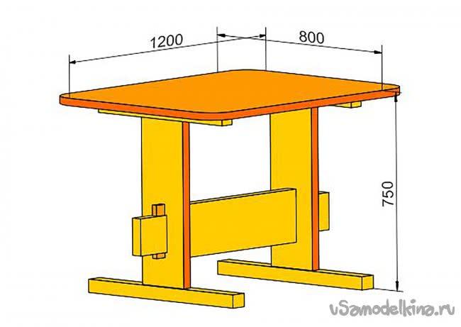 Итак, собрав целиком подстолье, закрепляем столешницу. Её можно крепить двумя способами — на шканты с использованием клея или, если хотите, чтобы стол был полностью разборный, снизу на конфирмат (достаточно будет четырёх шурупов на сторону). В разборном столе есть свои преимущества: его можно компактно убрать на зиму или же разобрать для обновления отделки. Габаритные размеры собранного стола приведены на рисунке.