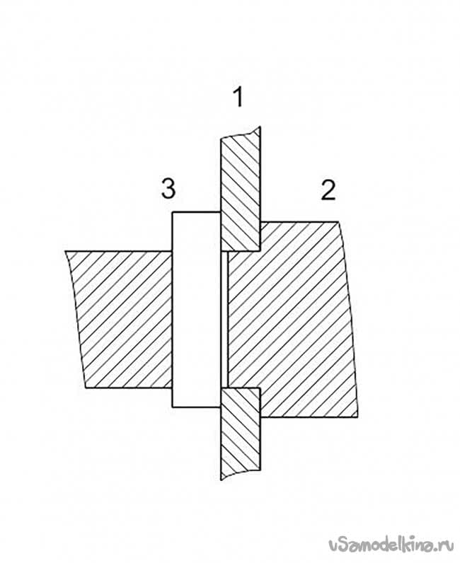 Далее, отступив от основания шипа приблизительно 20 мм (наполовину толщины стойки), вырезают сквозной паз, в который при сборке соединения забивают брусок 3 с небольшой