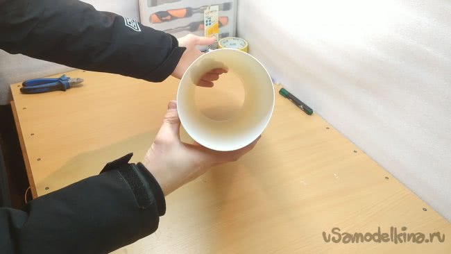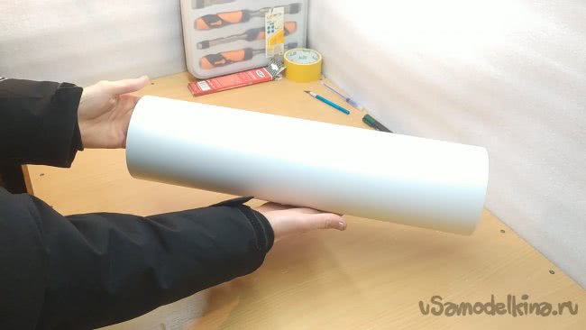 Шаг 1: Для изготовления нам понадобится вентиляционная труба 125 мм. Её можно купить длинной 50 см. Можно взять канализационную трубу "рыжая", но она толще и будет немного трудна в вырезании узора.