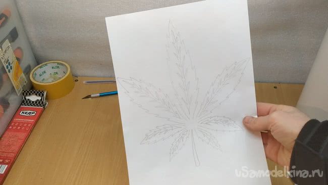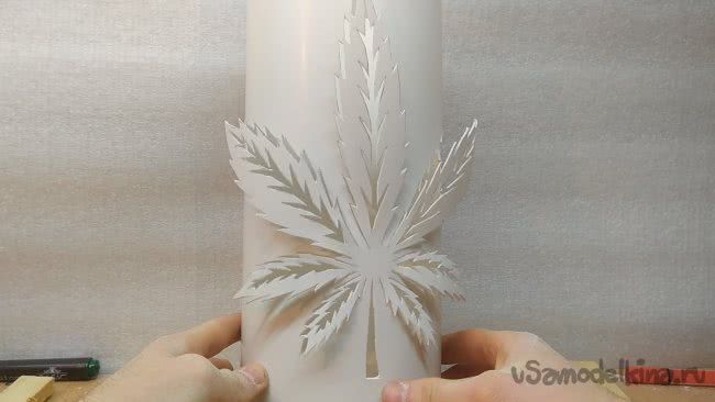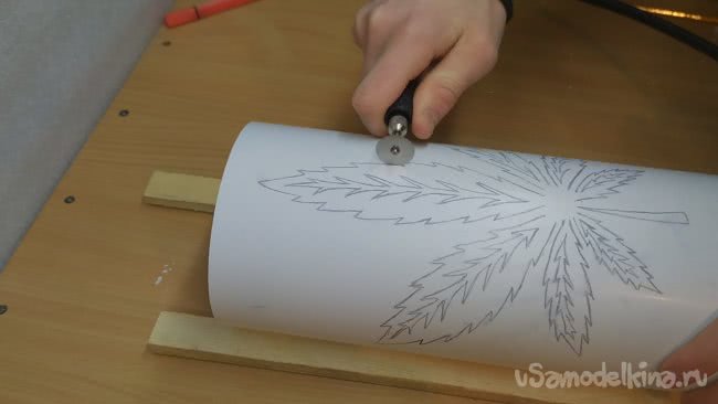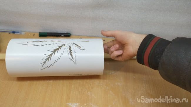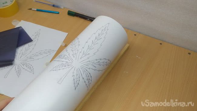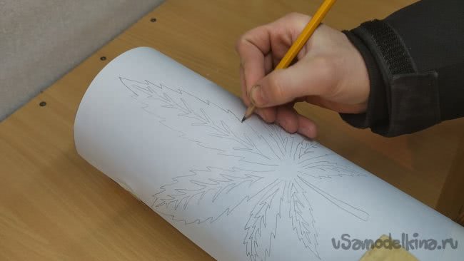 Шаг 2: На листе А4 чертим нужный нам рисунок. Узор можно выбрать какой угодно, всё зависит от вашей фантазии. Я взял "дубовый листик":) Затем берём копировальную бумагу и переводим узор на саму трубу.