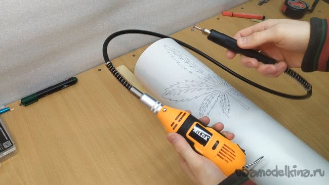 Шаг 3: Выпиливать узор мы будем бор машинкой. Можно попробовать ручным лобзиком или горячим скальпелем, но у меня есть машинка, поэтому я вырезал ей, так намного проще и удобнее. Затем отрезаем трубу нужной нам длинны.