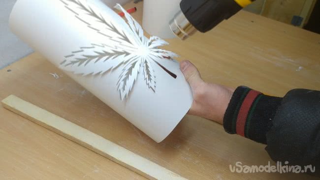 Шаг 4: При помощи фена нужно предать нашему ночнику объёмный вид. Главное во время процесса не перегреть пластик, а то он может потечь.