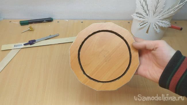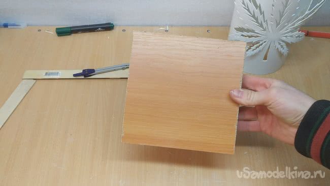Шаг 5: Из куска ДСП вырезаем нужную нам подставку. Я сделал вот такой многогранник как на фото. В подставке бор машинкой проделал паз под трубу, чтобы зафиксировать её там как можно крепче и надёжнее.