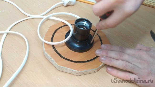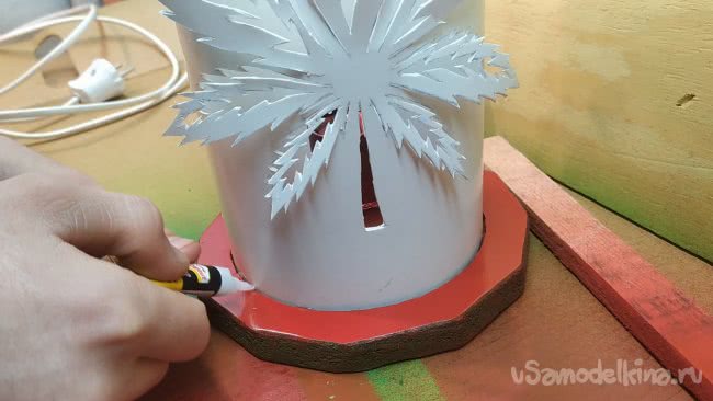Собираем все и прикручиваем патрон на подставку. Подставку я покрасил красной краской из баллончика. Далее Вставляем трубу в ранее проделанный паз и фиксируем её клеем моментом.