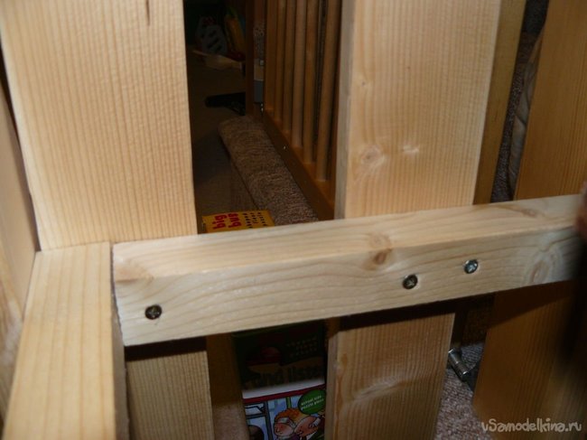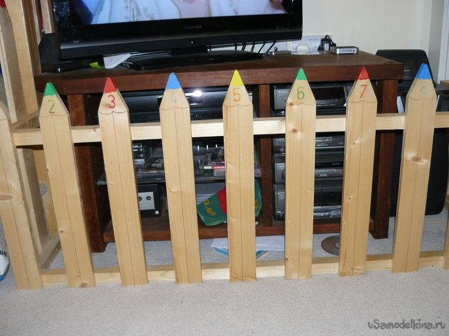 Каждый карандаш я крепил к поперечной планке двумя шурупами. Было два ряда поперечных планок - одна внизу, вторая на уровне скосов карандашей. Карандаши важно надежно закрепить, так как ребенок будет тянуть их на себя в попытках оторвать. Расстояние между карандашами было около 8 см.