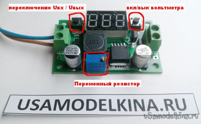 На плате импульсного DC-DC понижающего преобразователя есть две кнопки. Кнопка, рядом с которой на плате есть надпись IN, включает и выключает светодиодный вольтметр при последовательном нажатии на нее. Кнопка, рядом с которой на плате есть надпись OUT, меняет на светодиодном вольтметре показания входного (IN) напряжения и выходного (OUT) напряжения при последовательном нажатии на нее. При этом загорается соответствующий светодиод. Рядом с этими светодиодами на плате нанесены надписи IN и OUT.