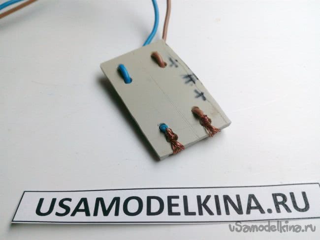 Пластинка из диэлектрического материала с проводами для подключения регулируемого понижающего модуля питания к отсеку для батареек фотоаппарата. Пластинка самодельная. Она устанавливается в отсек фотоаппарата для батареек типа АА.