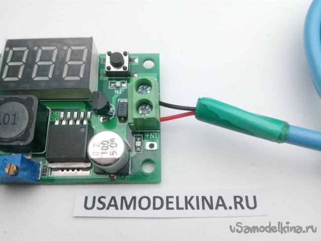 Подключаю красный провод USB кабеля к клемме IN+ импульсного DC-DC понижающего преобразователя, а черный провод к клемме IN- импульсного DC-DC понижающего преобразователя. Теперь можно подключать USB кабель к Power bank и настраивать выходное напряжение переменным сопротивлением на плате импульсного DC-DC понижающего преобразователя, контролируя его по светодиодному вольтметру.