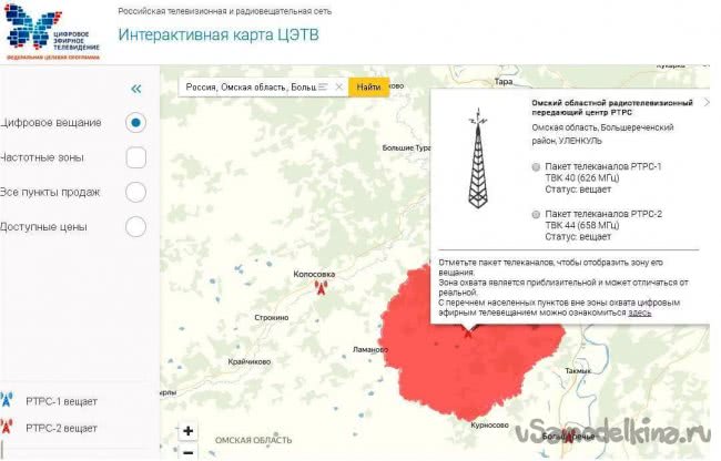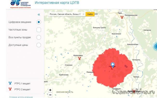 При нажатии кнопки РТРС-1 или РТРС-2 обозначается зона охвата вещания (красным или синим цветом) данного телепередающего узла.