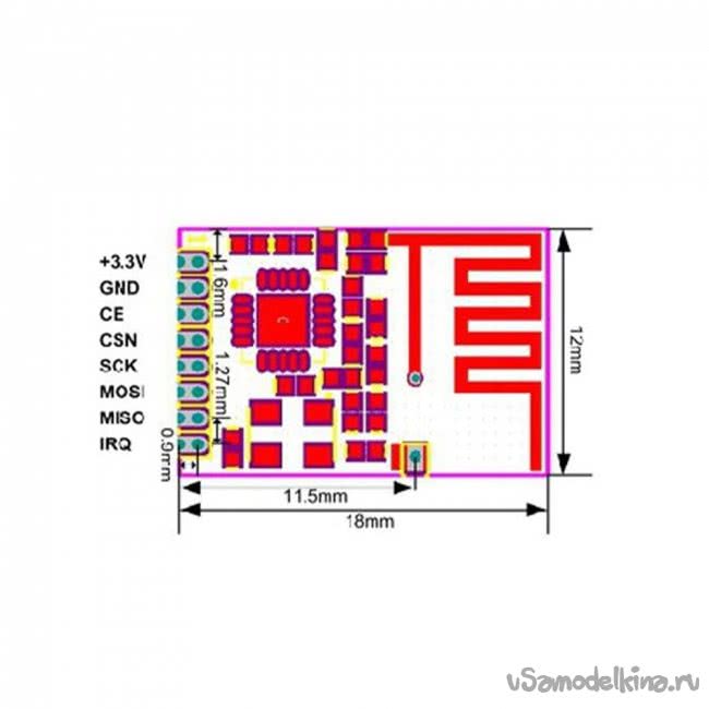 Переходим к радио модулю. Для этого пульта мы будем использовать nRF24L01+. Этот радио модуль работает на частоте 2.4 ГГц. На плате у него нет стабилизатора напряжения. А модуль работает от напряжения в 3.3 вольта. Поэтому работать он у нас будет от стабилизатора Arduino. У наиболее распространённых модулей размер платы 28,5 х 15,2 мм. Можно использовать такие модули, к ним легче припаивать провода, так как расстояние между контактами 2,54 мм.