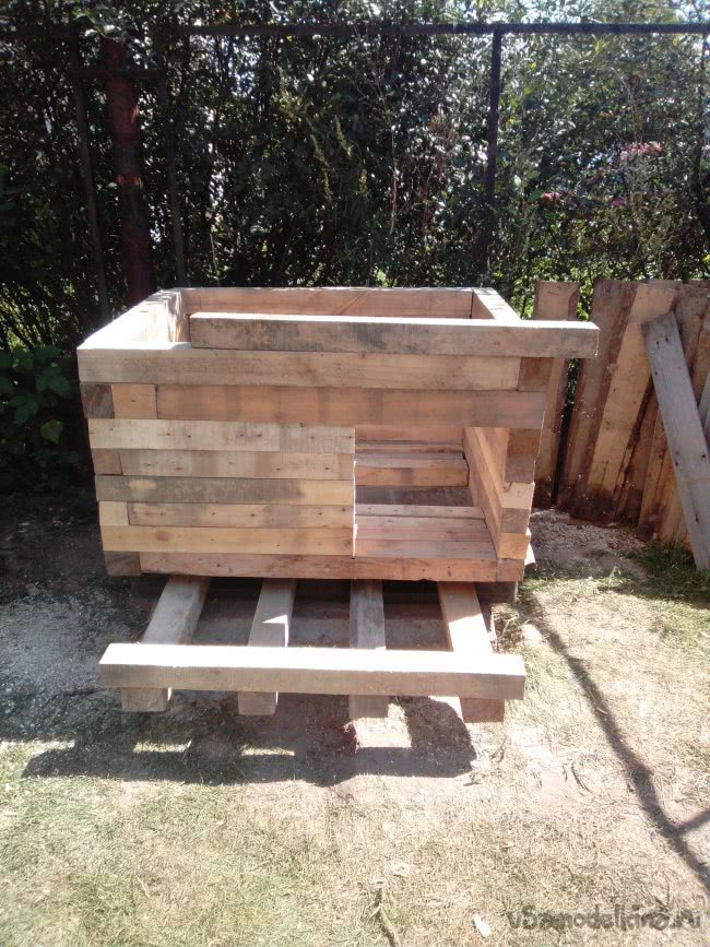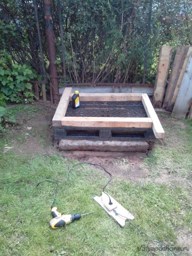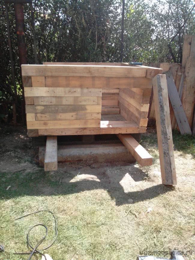 Так и собираем потихоньку подбирая брусок к бруску (по факту оказались все разного сечения). Где то наставляем длину, лишнее отпиливаем. Поддон прямоугольный, да будка не квадрат, старался материал использовать по максимальной длине.