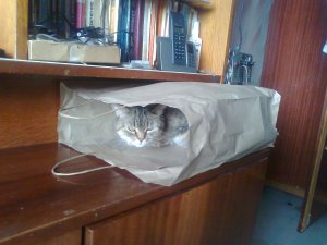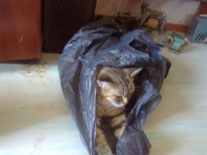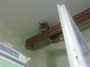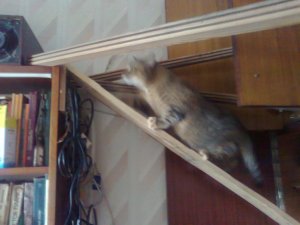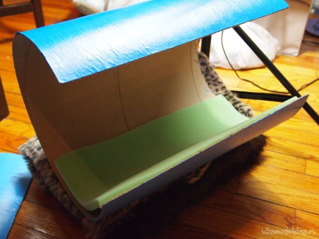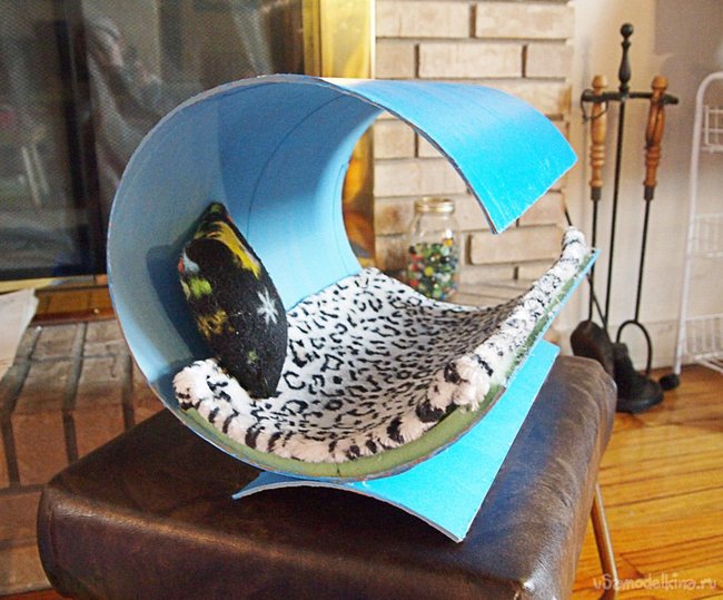 Это веселая самоделка, не требующая много денег или времени. Коты любят прятаться, и этот закругленный верх делает домик подходящим укромным местечком. Мои племянницы думали, что я добавлю шторки по сторонам… и еще много советов я от них получил. Они хотели, чтобы я нарисовал рыбку на котодомике, подвесил внутри игрушки. Идеи хорошие, не правда ли?