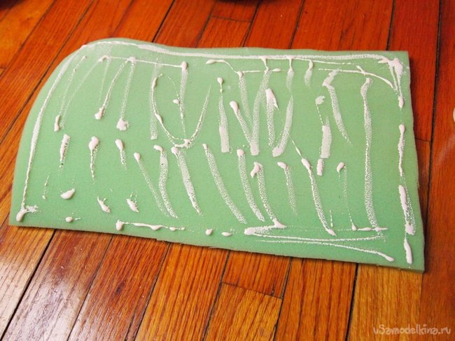 Если у вас есть кусок поролона, приклейте его на дно домика до того, как приклеите сам домик к фундаменту.