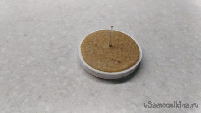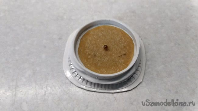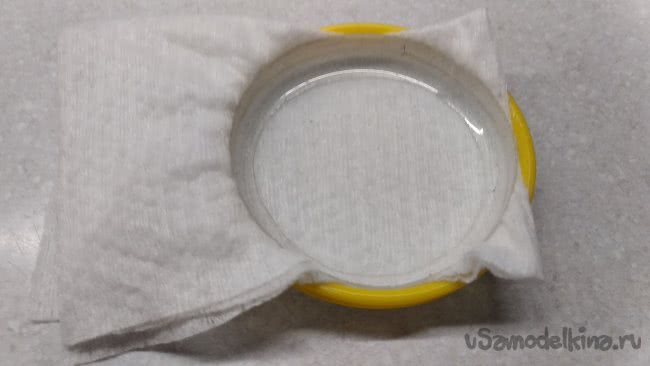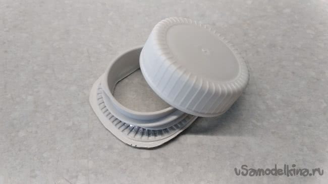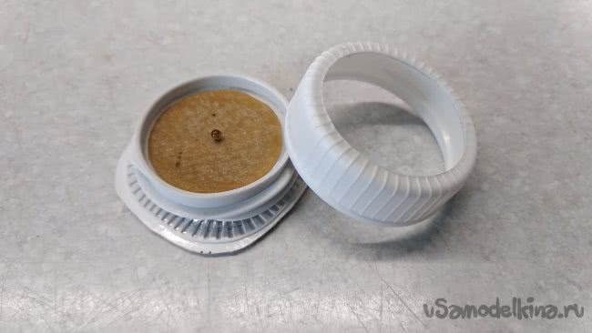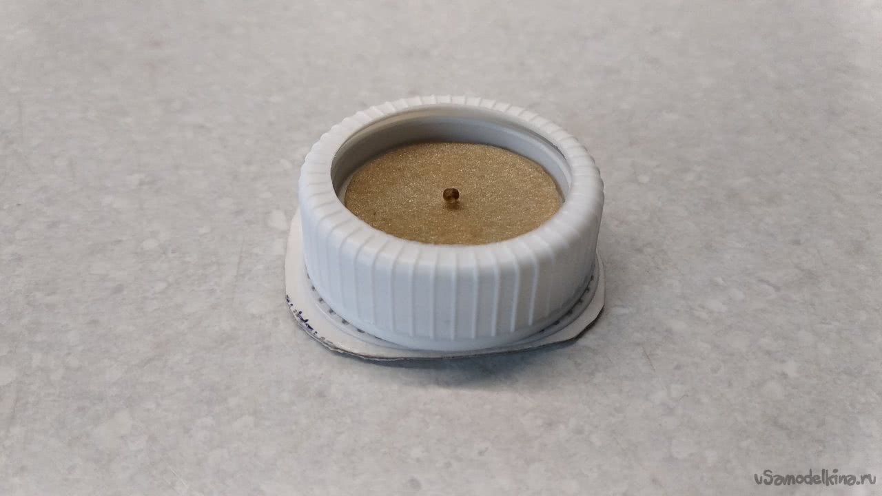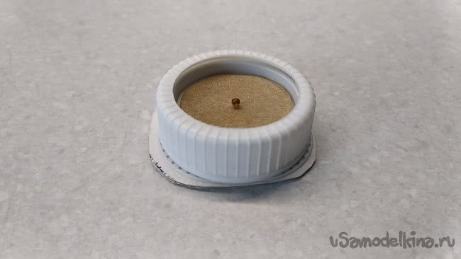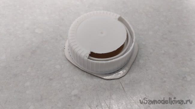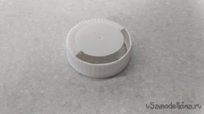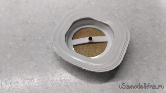 В крышке, с просверленным в центре отверстием диаметром 1,0 ÷ 1,2 мм, уголком обломанного безопасного лезвия, вырезать два полукруглых отверстия, при радиусе их разметки 9 мм.