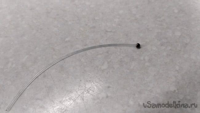 Протащив леску через центральное отверстие основания клапана и сквозь прокол вырезанного резинового кружка, обрезать на длину 10 ÷ 12 мм.