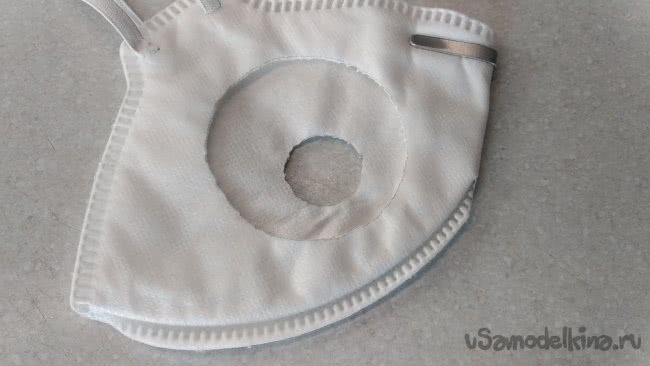 На следующем этапе следует разметить сделать два отверстия, по одному на каждой из половинок полумаски, для крепления изготовленного клапана выдоха и оправки фильтрующего элемента.