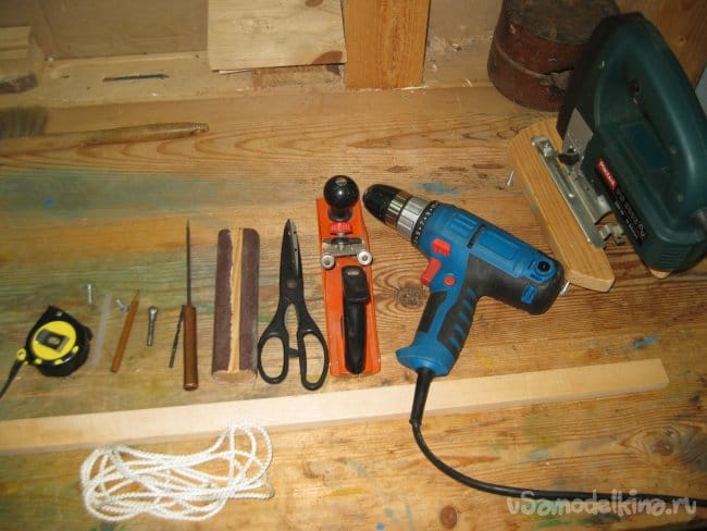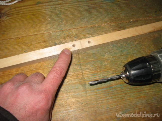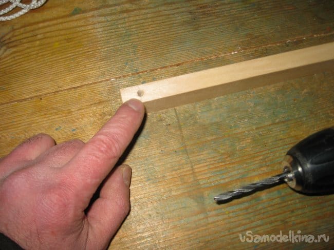 Дрелью со сверлом диаметром 4,5 мм, сверлим по краям будущих планок отверстия под веревку.