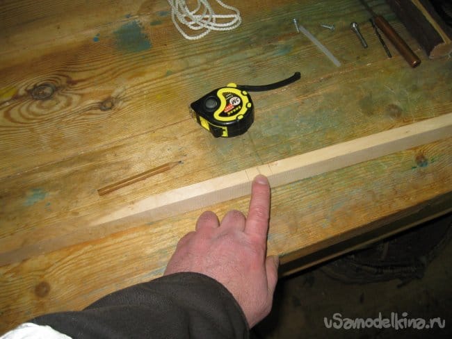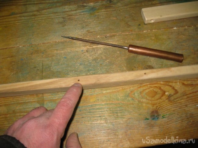 Размечаем в середине одной из планок, отверстия под шурупы с прессшайбой, которые будут служить для регулировки длины веревки, и накалываем их шилом.