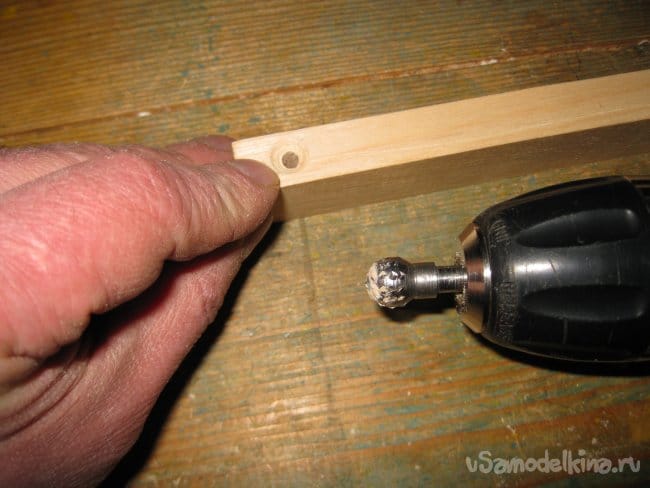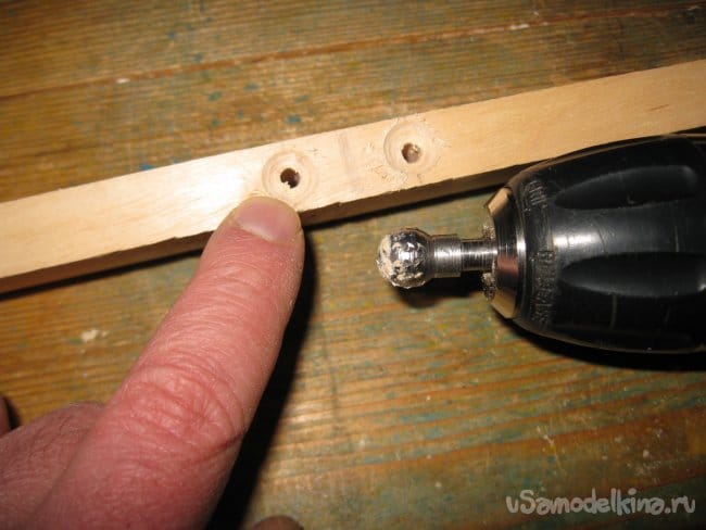 Чтобы острые кромки отверстий не резали и не перетирали веревку, при помощи сферической фрезы по дереву, притупляем эти кромки, слегка раззенковывая отверстия.
