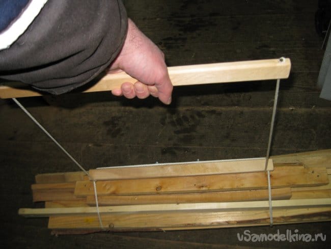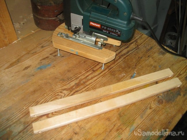 При помощи электролобзика или обычной ручной пилы, распиливаем нашу заготовку на две одинаковые планки.