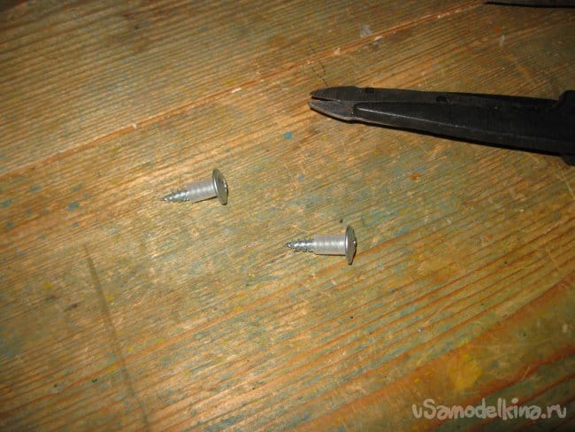 При помощи ножниц, отрезаем от пластиковой трубочки дозатора жидкого мыла два кусочка, длиной по 1 см, и надеваем их на шурупы с прессшайбой. Это необходимо для того, чтобы веревка не перетиралась о резьбу шурупов.