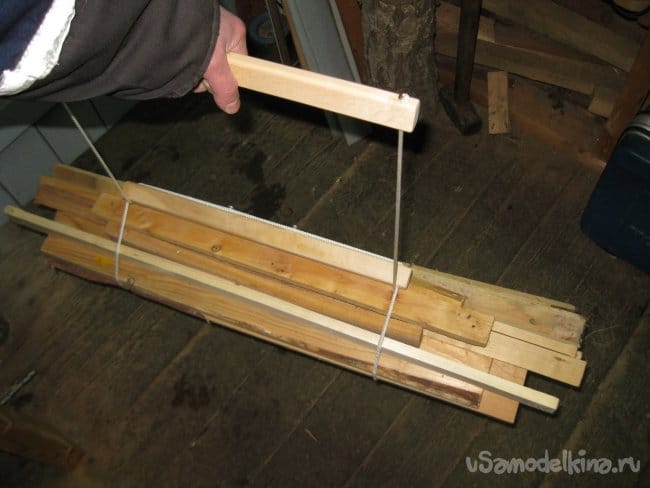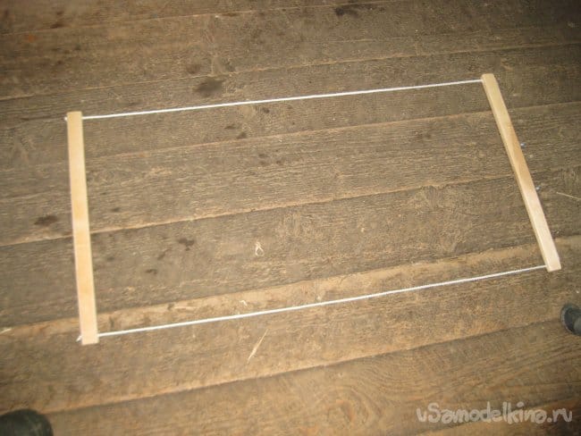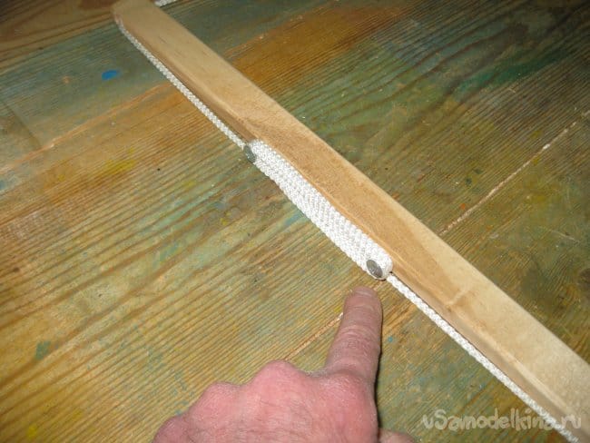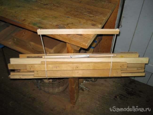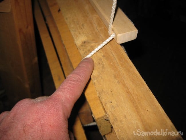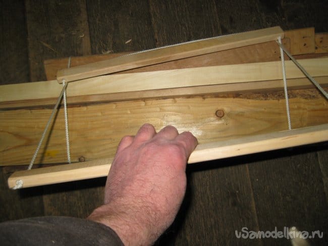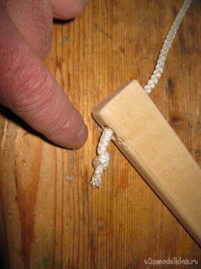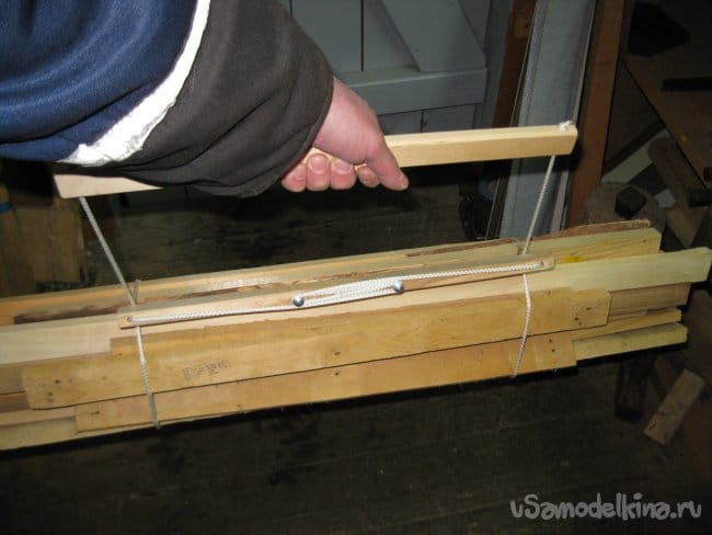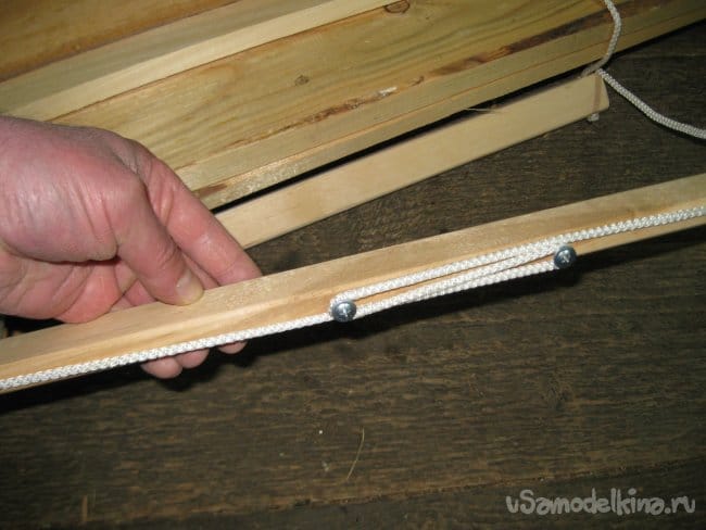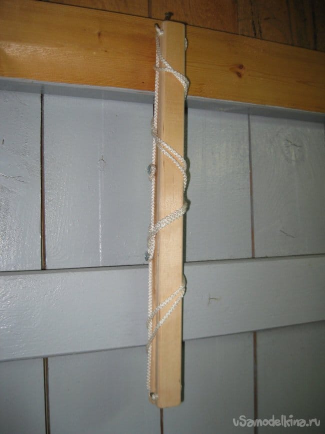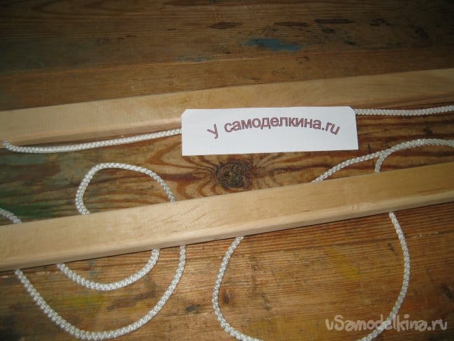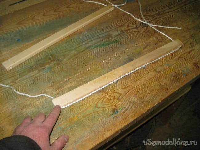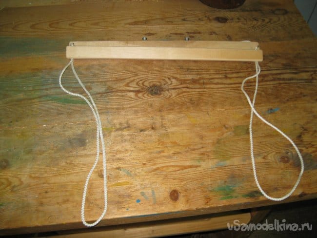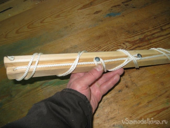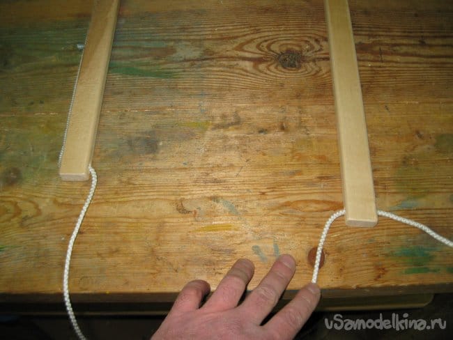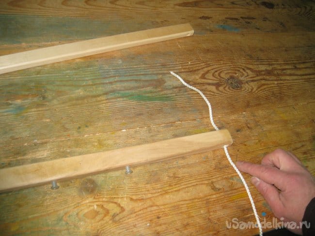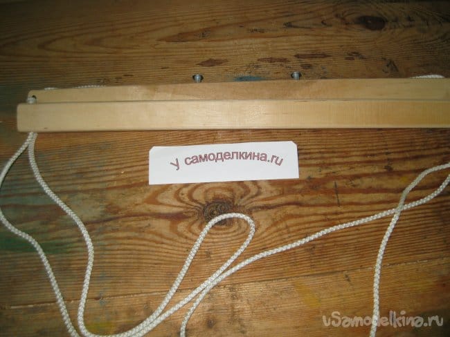 Продеваем веревку в отверстия планки с шурупами, а затем и в отверстия планки, которая будет служить нам рукояткой.