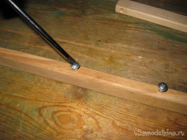 Именно поэтому, в данном случае очень желательно укоротить длину веревок нашей переноски. И для этого, мы как раз используем шурупы, ввернутые в нижнюю планку.