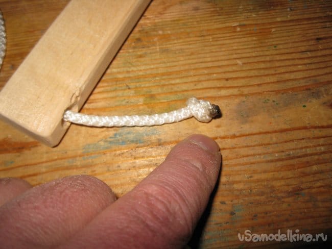 На обоих концах веревки, завязываем узелки, чтобы она не выскользнула из отверстий в рукоятке, а оставшиеся кончики веревки оплавляем при помощи зажигалки или спичек.