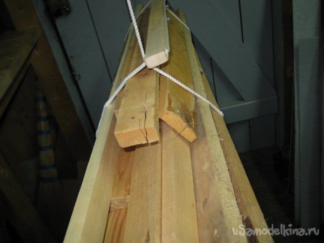 Теперь берем планку служащую рукояткой в руку и наступив ногой на другую планку, хорошенько затягиваем охапку досок и брусков лежащих в нашей переноске.