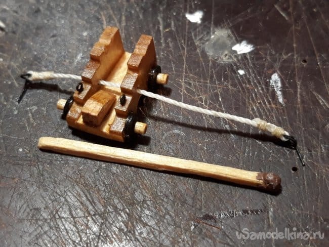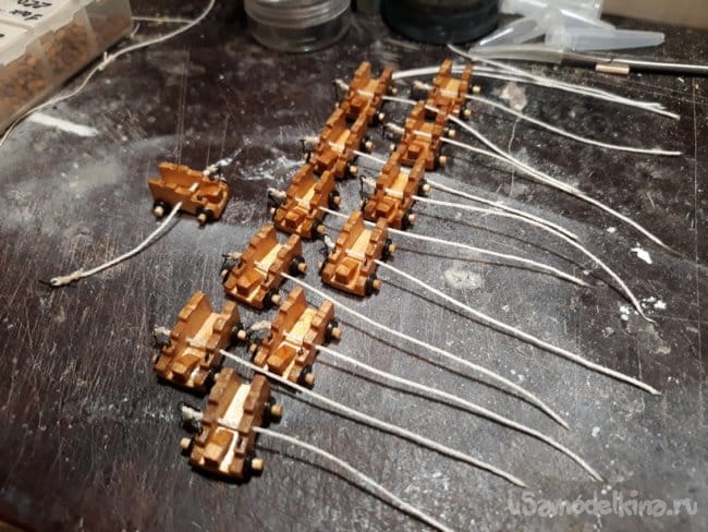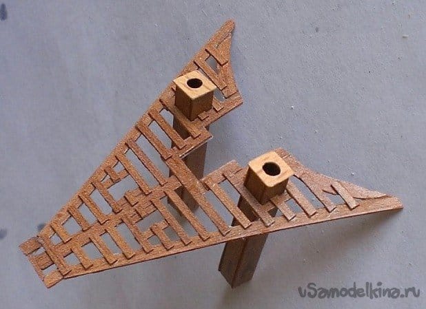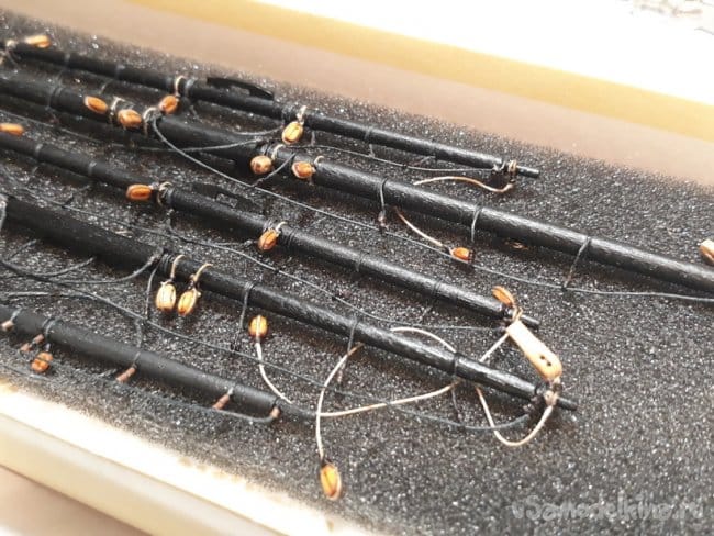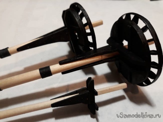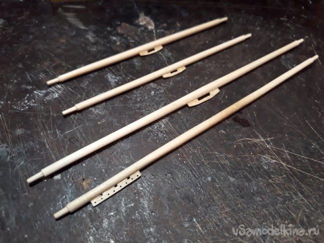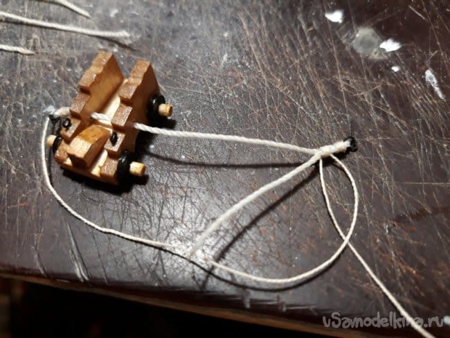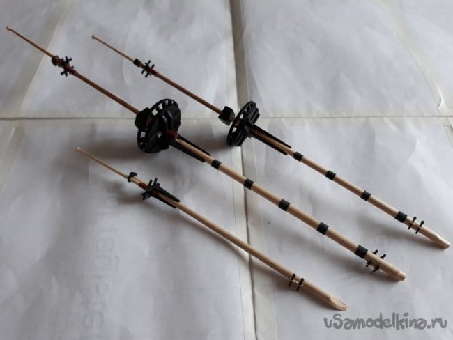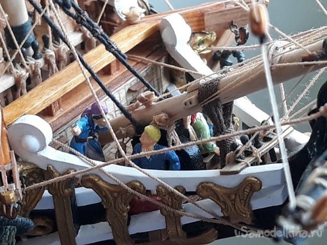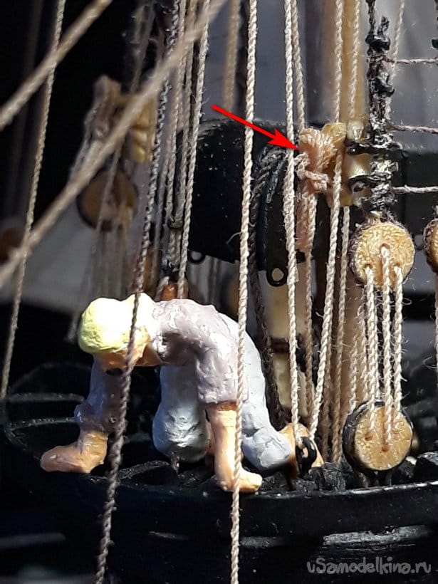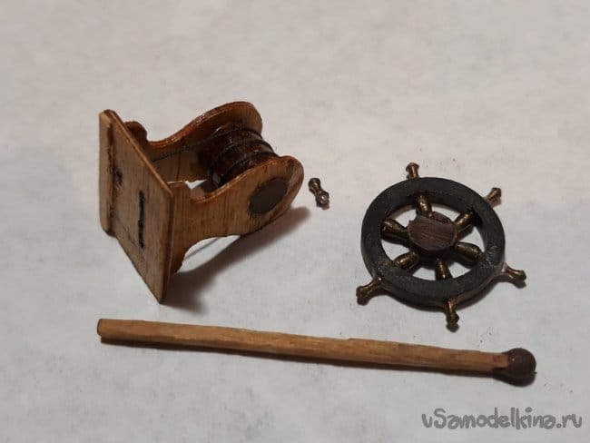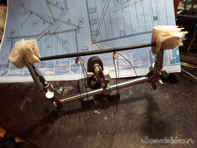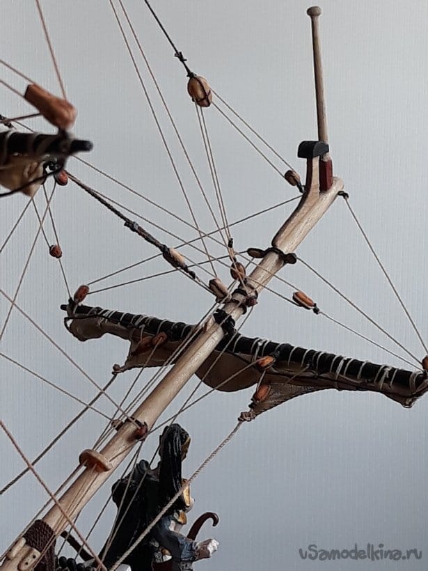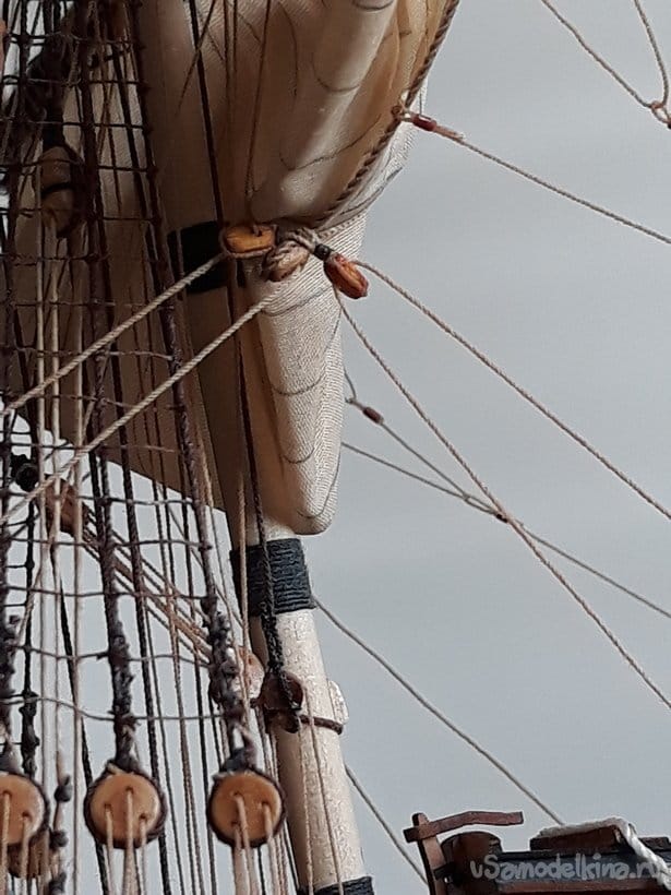 Для проводки такелажа нужны были различные по диаметру канаты, поэтому был сделан самодельный тросомот, и ручная клетневала. Эти приспособления можно посмотреть у меня на страничке.