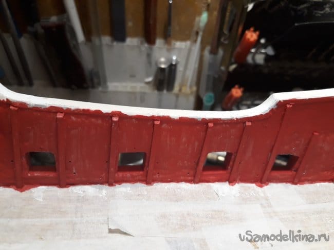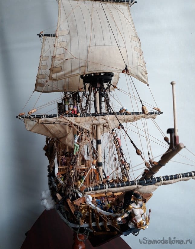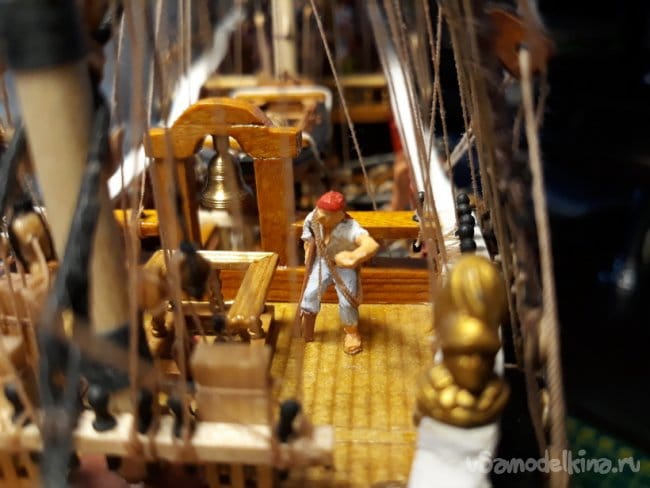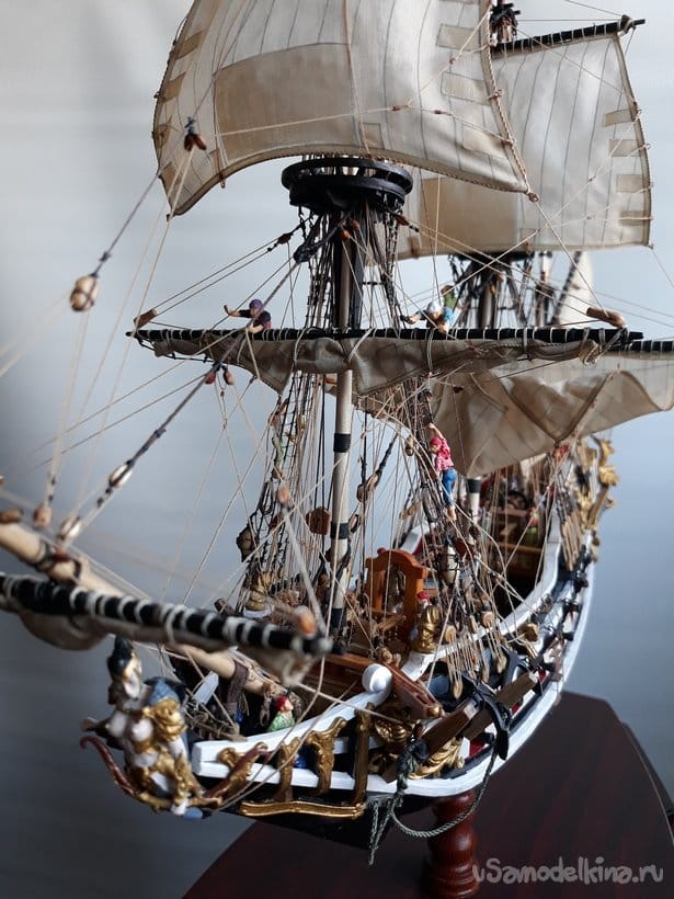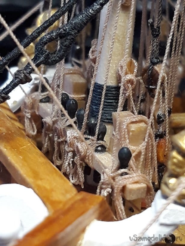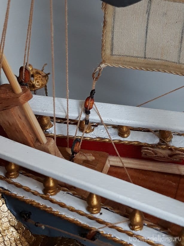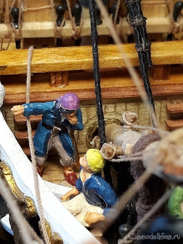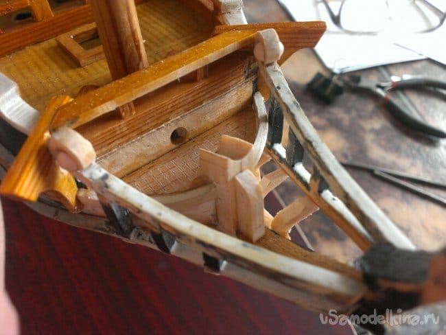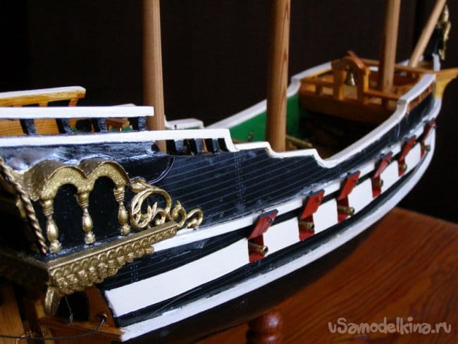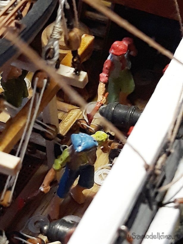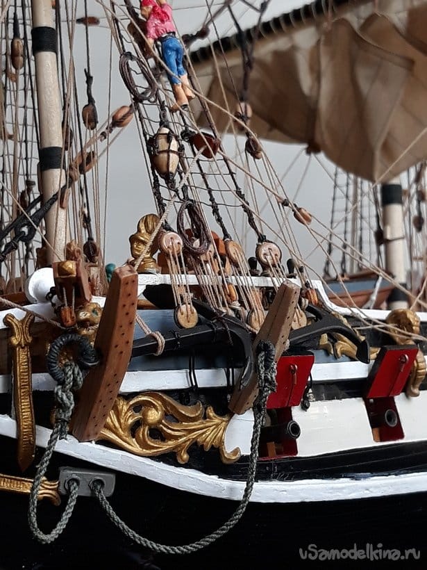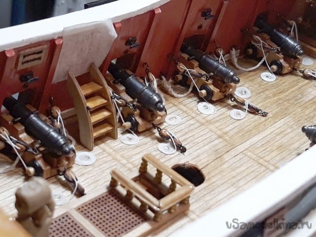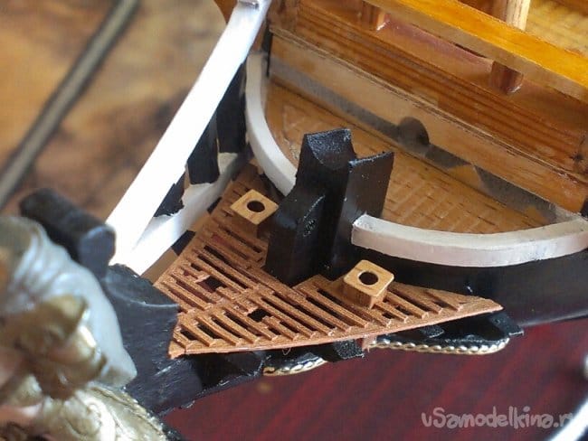 Палуба была вновь ошкурена и покрыта лаком, борта выкрашены в красный цвет. При установке на модель была сделана обвязка пушек. Были сделаны сходные трапы в трюм.