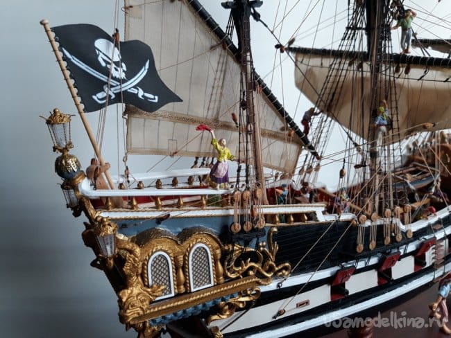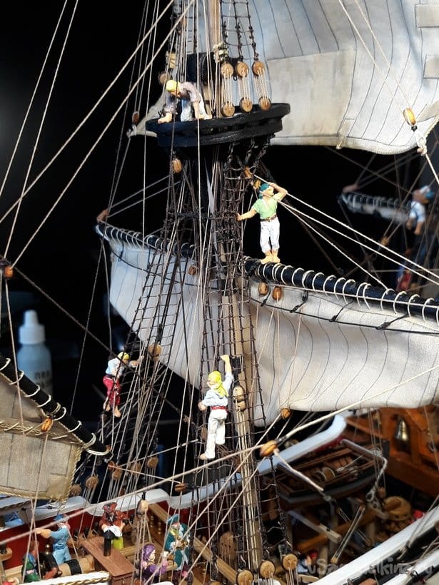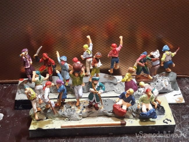 Чтобы команда не была «статической», я решил создать, как бы это сказать…. несколько сценок. С естественными позами членов команды (фигурок). Так что бы они (сценки) дополняли друг друга. Тогда, на мой взгляд, удастся создать «действующую» команду, которая дополнит и украсит модель пиратского фрегата. Что получилось судить Вам. Всего фигурок 30 штук.