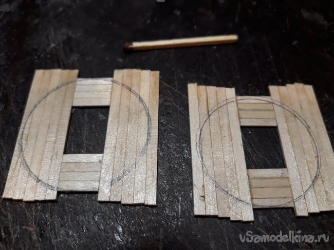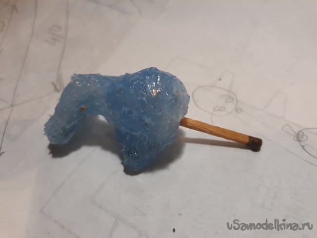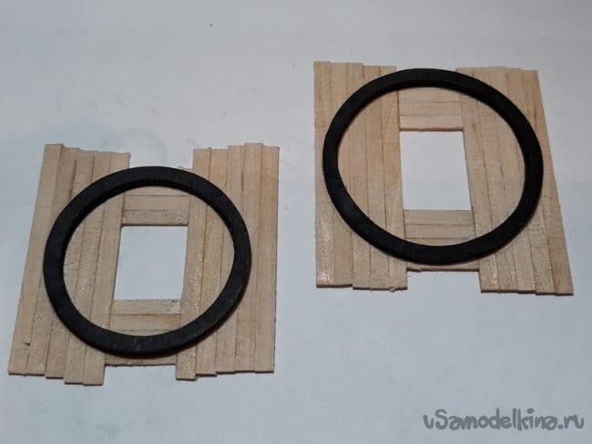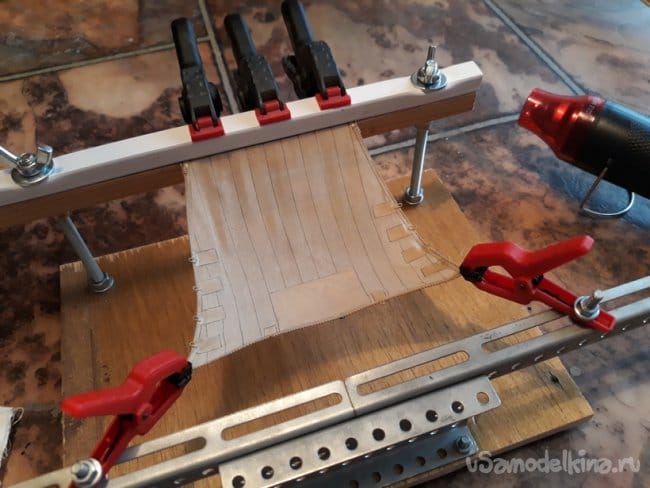Пространство между шпангоутами я заполнил пенопластом и обточил по обводам корпуса. Затем, на подготовленный таким образом набор корпуса, была наложена имитация дощатого настила корпуса корабля из эпоксидной смолы. Которая была закреплена на модели обыкновенными булавочками до полного затвердевания смолы.