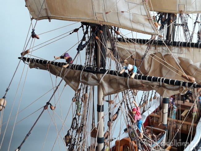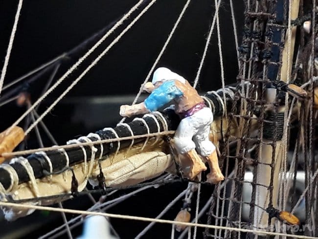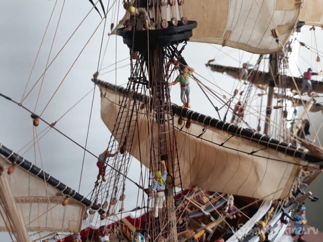 Монтаж накопившихся деталей начал со стоячего такелажа. Установки мачт, проводки мачт-талей, затем вант и штагов.