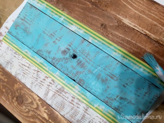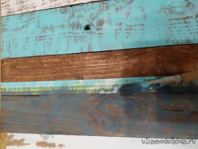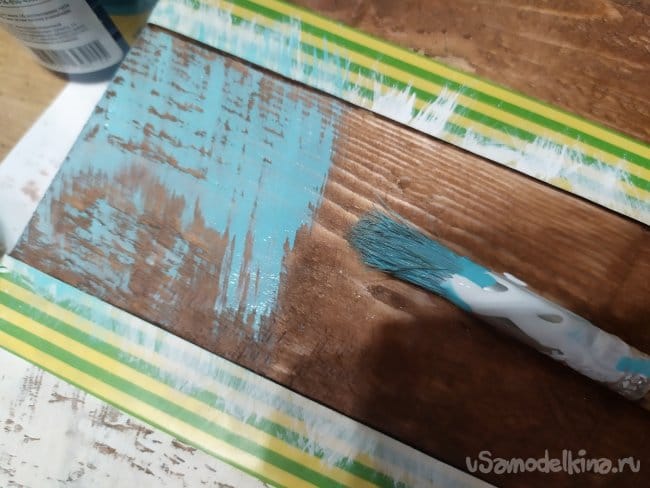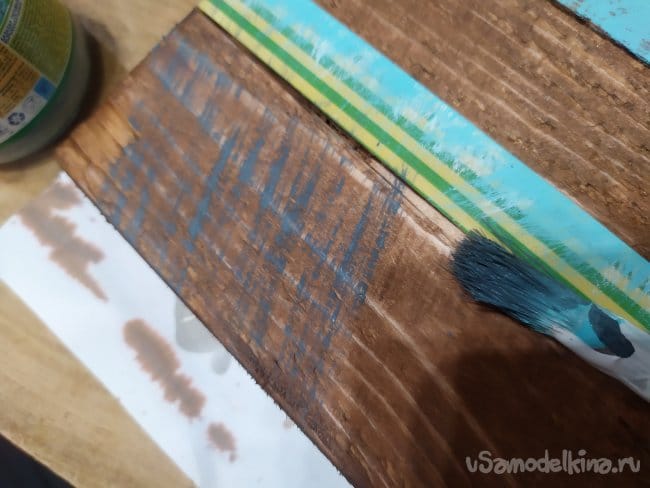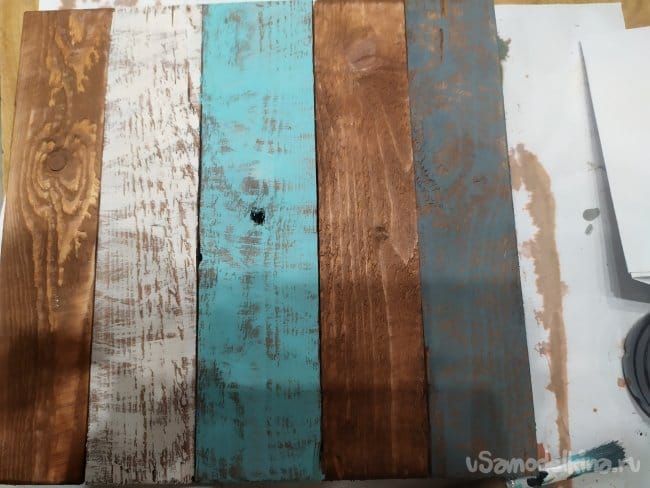 После высыхания лака, я слегка выкрашу дощечки в разные цвета. Я выбрала белый, серый и бирюзовый цвета.