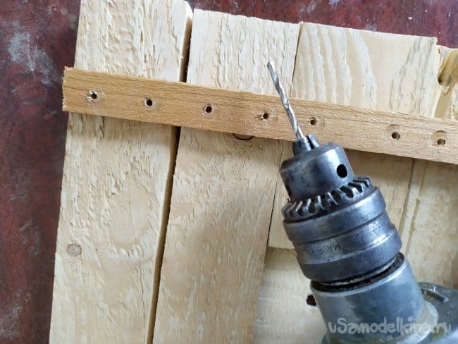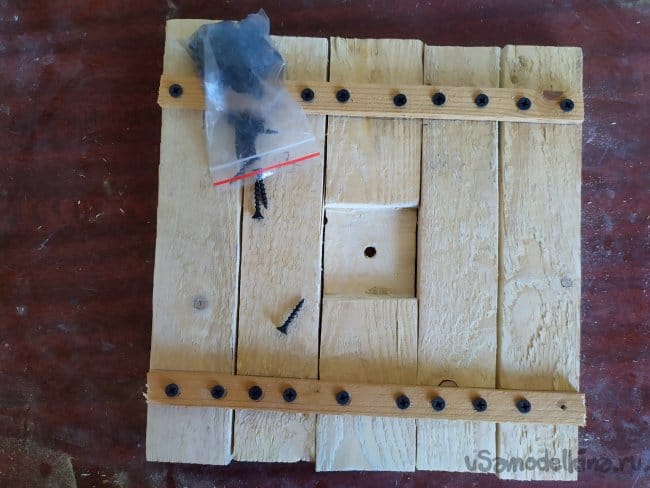 Теперь, прикручиваем рейки, как видно по фото, на каждую дощечку по два самореза.
