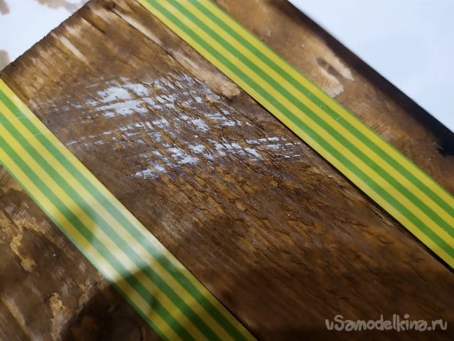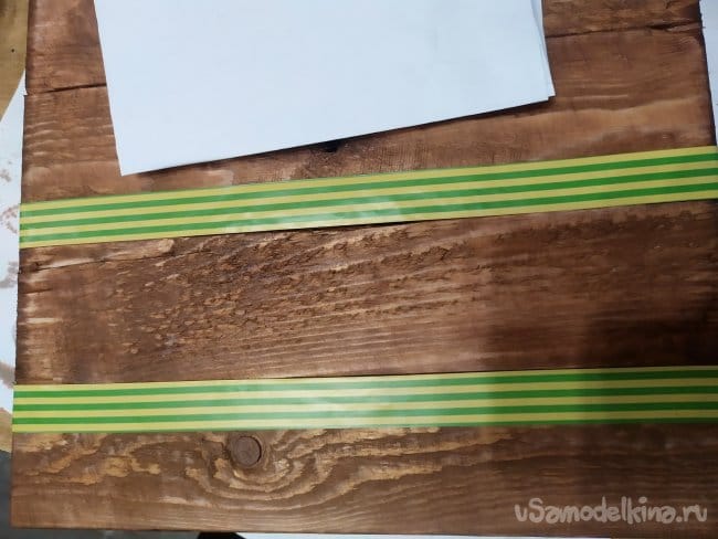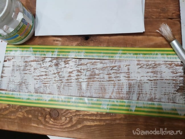 Первый будет белый, я использую обычную акриловые краску. Наливаем в маленькую баночку. Выбираем любую досточку, и обклеиваем ее липкой лентой или малярным скотчем с двух сторон.