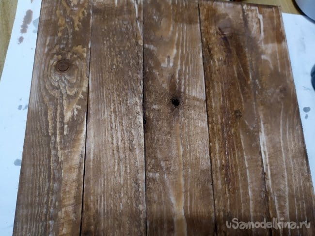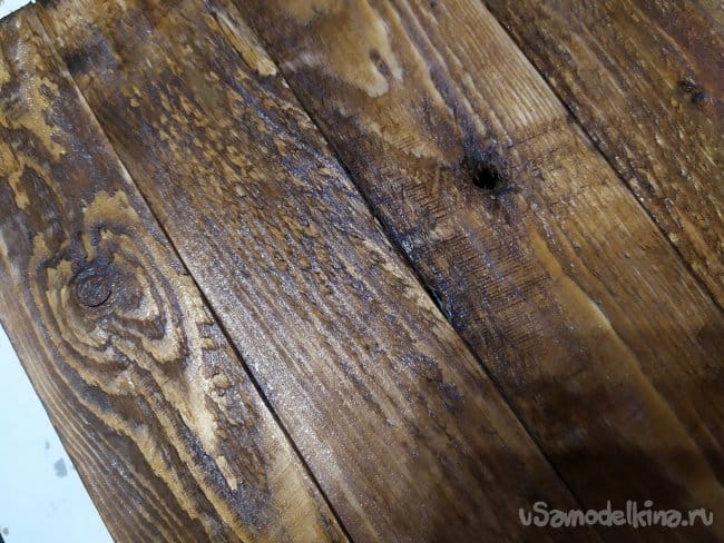 Таким образом, мы не зальем доску краской, а лишь местами перекроем морилку, это создаст эффект старины.