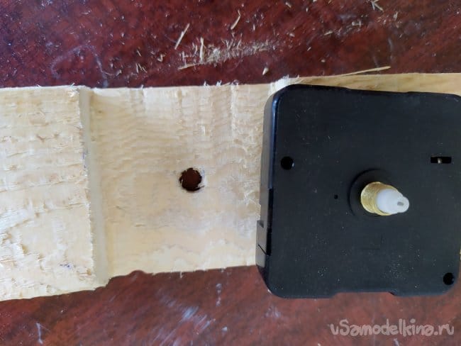 Теперь пора подумать о том, как разместить часовой механизм. Хочу обратить внимание, что при покупке механизма, важно обратить внимание на резьбу. Она должна быть длиннее, чем толщина дерева, в которую вы его будете вставлять. У меня резьба имеет длину 5мм, а толщина дерева 15 мм, то есть резьба просто не будет "выглядывать" из отверстия, поэтому придется делать углубление для механизма. Но если знать эти тонкости заранее, то можно просто подобрать большую резьбу.